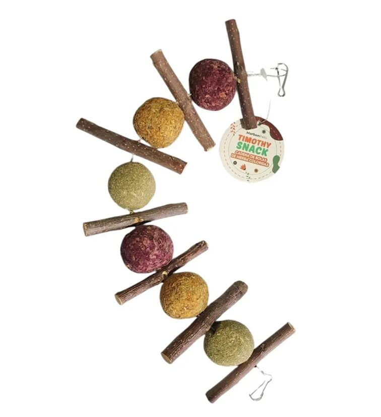 Snack con forma de tronco relleno con semillas, perfecto para enriquecer el hábitat de tu conejo o roedor.