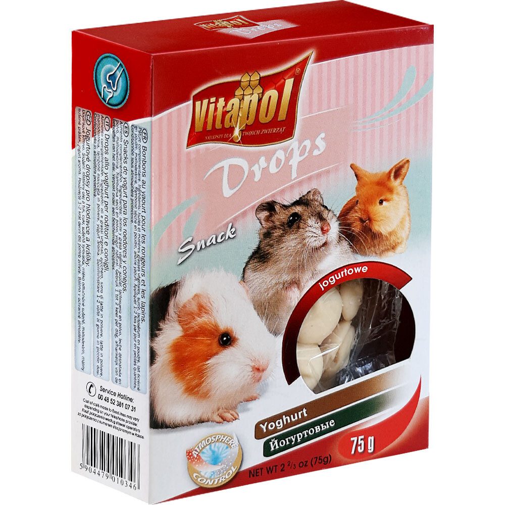 Vitapol Drops son snack para roedores, como hámster, jerbos, ratas y ratones, con sabroso sabor a yogurt y enriquecidos con minerales y vitaminas.